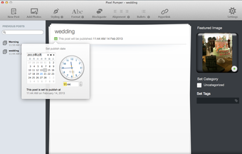 Pixcel Pumperのもう1つの特徴は、オフラインでも下書きを保存したり予約投稿ができる点です。予約投稿は記事のタイトルのすぐ下にあるカレンダーのアイコンから、日時の指定ができます。また、Word Pressのブログであれば複数のブログを管理することも可能です。その際には「Setting」画面を開き、左下の「+」ボタンをクリックして追加したいブログを同様の手続きで登録します。